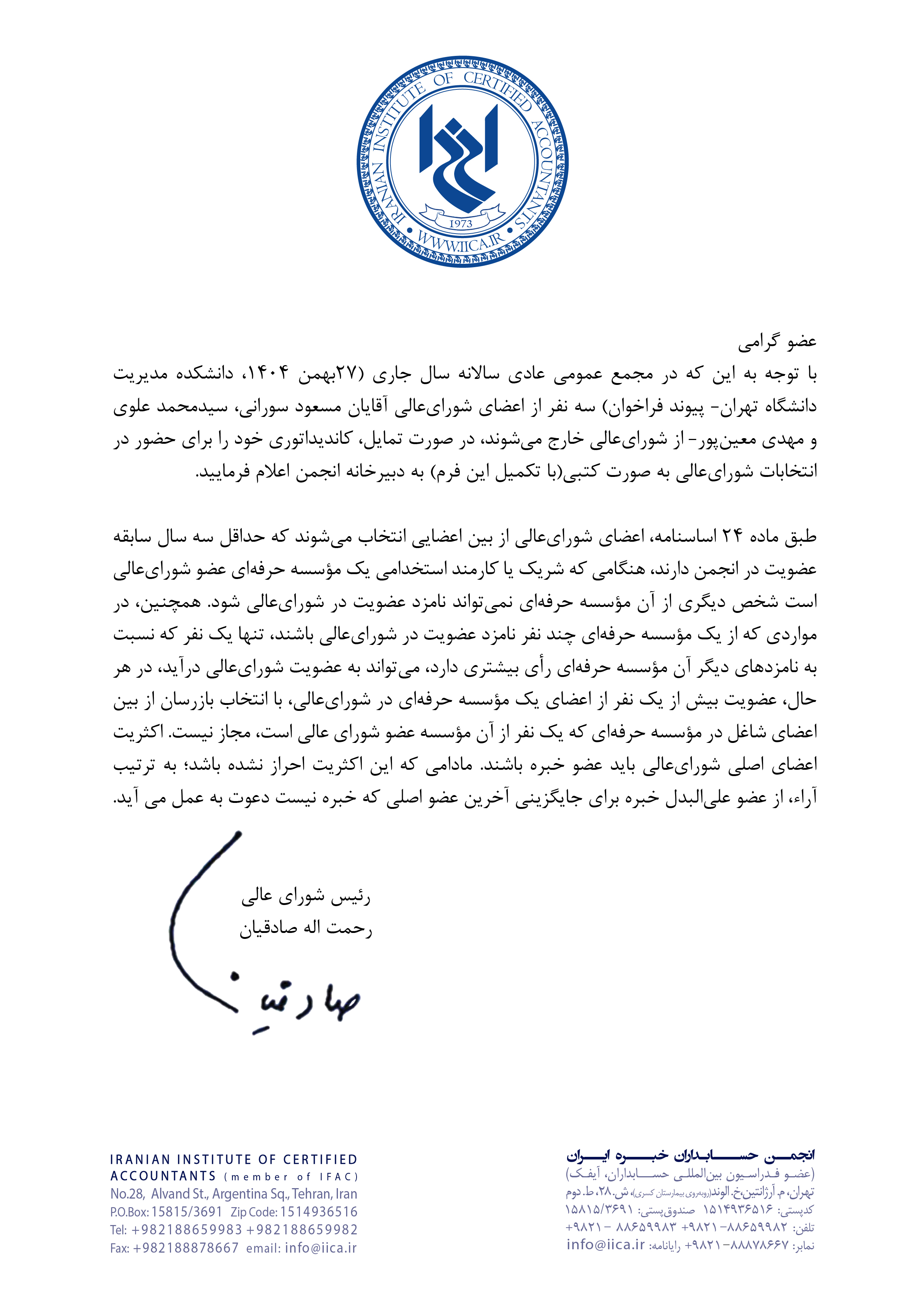 رحمت اله صادقيان ، رئيس شوراي عالي انجمن حسابداران خبره ايران، در اجراي مواد ۱۴ و ۱۵ اساسنامه، اعضاي انجمن را براي شرکت در مجمع عمومي عادي سالانه فراخواند (پيوند فراخوان). مطابق اين فراخوان، با توجه به اتمام دوره عضويت سه تن از اعضاي شوراي عالي، در مجمع يادشده انتخابات شوراي عالي نيز براي برگزيدن سه عضو جديد برگزار خواهد شد.