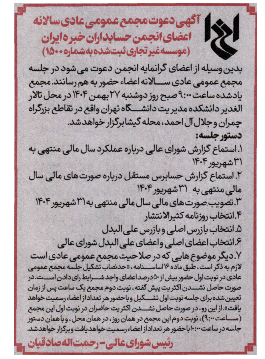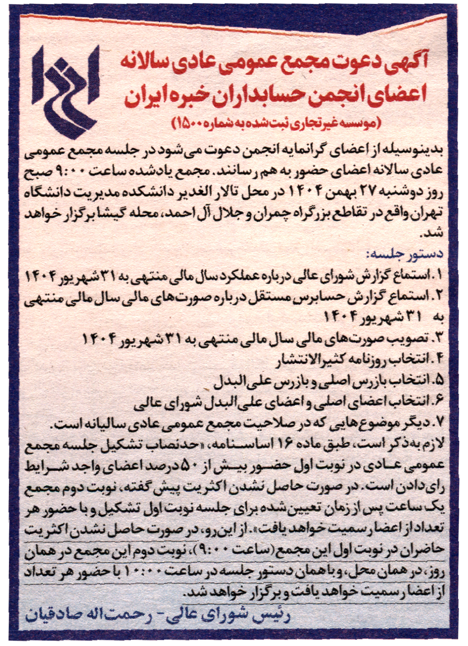 مطابق آگهي فراخوان منتشرشده در روزنامههاي اطلاعات و دنياي اقتصاد ( دوشنبه، ۱۳بهمن ۱۴۰۴) نوبت اوّل مجمع يادشده، ساعت ۹:۰۰، روز دوشنبه، ۲۷ بهمن ۱۴۰۴، در تالار الغدير دانشکده مديريت دانشگاه تهران برگزار خواهد شد. در صورت حاصل نشدن اکثريت حاضران در نوبت اوّل، نوبت دوم مجمع در همان روز، در همان محل، و با همان دستور جلسه، با حضور هر تعداد از اعضاء در ساعت ۱۰:۰۰ رسميت خواهد يافت.