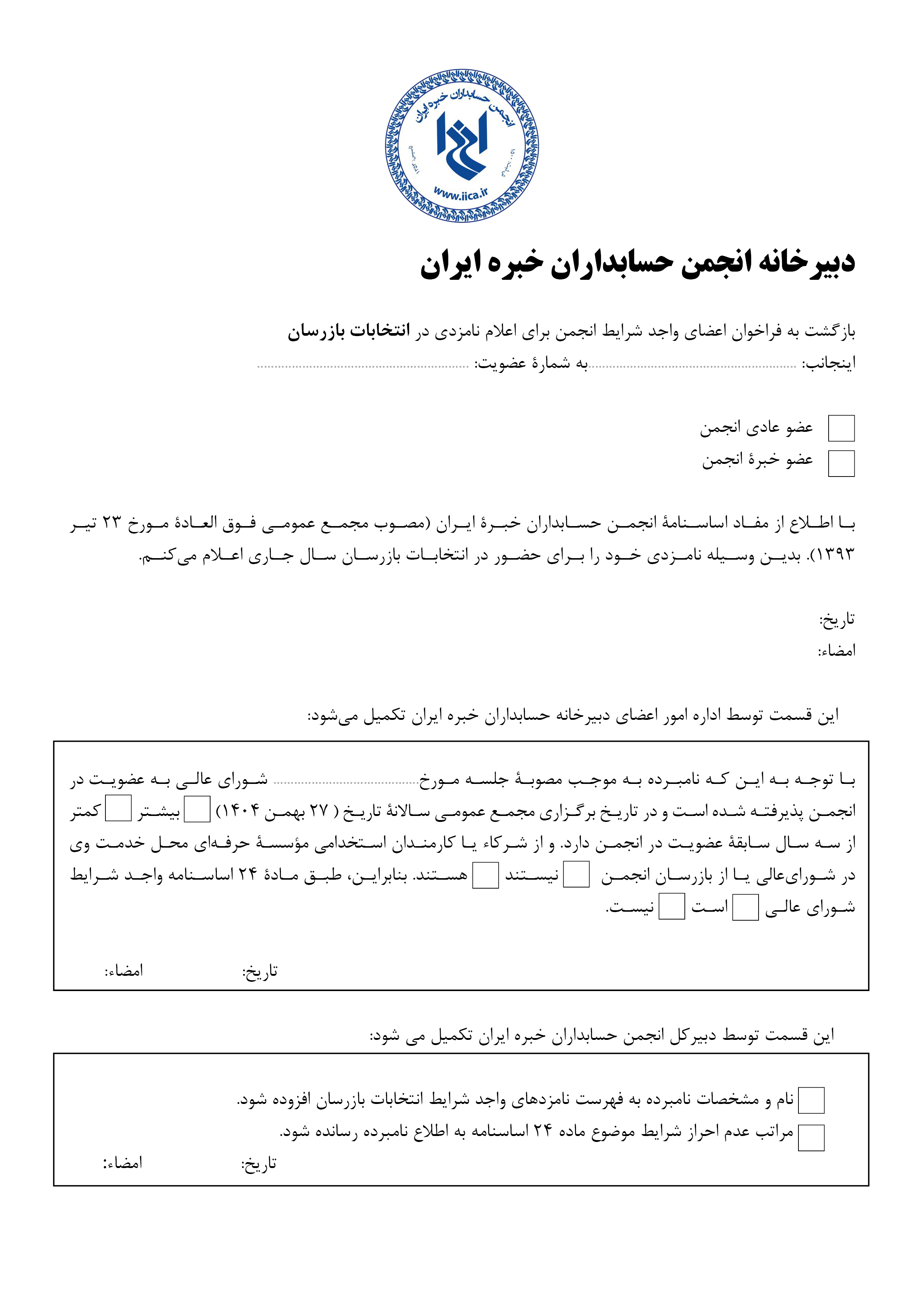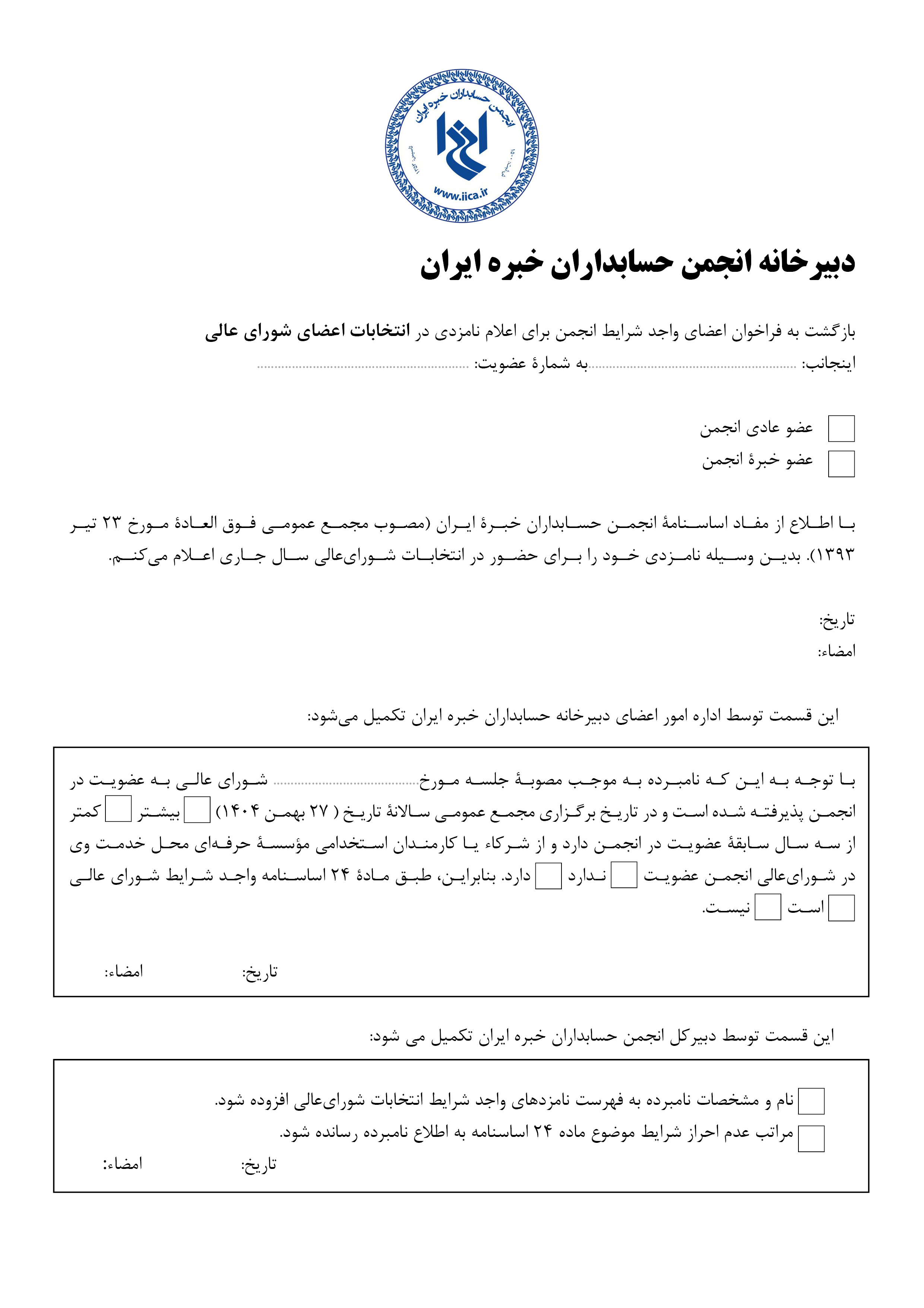 اعضاي متقاضي نامزدي در اين انتخابات ميتوانند تا پايان وقت اداري چهارشنبه ، ۲۵ بهمن ۱۴۰۴، فرم نامزدي در شوراي عالي (کليک کنيد) و فرم نامزدي بازرس(کليک کنيد) انجمن را تکميل و پس از امضاء به دبيرخانه انجمن به نشاني تهران، ميدان آرژانتين، ابتداي خيابان الوند، روبهروي بيمارستان کسري، شماره ۲۸، طبقه دوم، يا به دورنگار دبيرخانه انجمن به شماره 02188878667 يا يا members@iica.ir یا از طریق پیام رسان بله به شماره 09126333154 ارسال کنند.